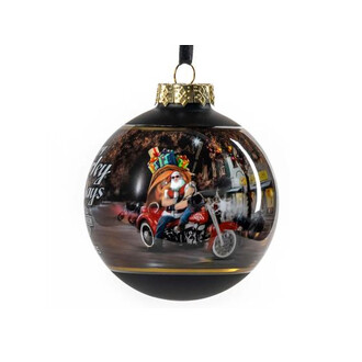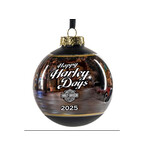Mattschwarze Glas-Weihnachtskugel mit rundum verlaufender Biker-Santa-Szene. Datiert auf 2025 mit Bar & Shield Logo und Happy Harley Days auf der Rückseite.
