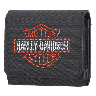Harley-Davidson® Damen-Geldbörse mit Strassverzierung und Bar & Shield-Logo, Schwarz. Polyester. Druckknopfverschluss. Strassverziertes Bar & Shield-Logo. Innenliegende Kreditkartenfächer. Innenliegendes Reißverschlussfach. Maße: 19 x 9,7 x 2,5 cm.