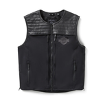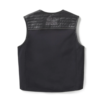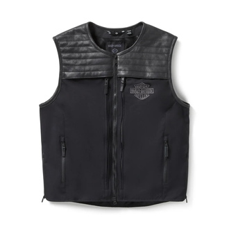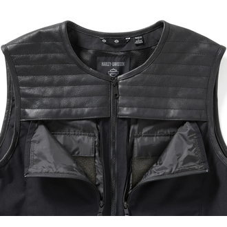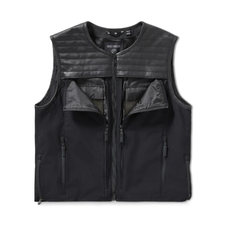 Unsere H-D® Long Haul Utility Weste vereint Funktionalität und Stil. Sie ist robust aus einem Mix aus schwerem Nylon und Rindsleder gefertigt und verfügt über ein leichtes Netzfutter. Der Zwei-Wege-Reißverschluss vorne und der lederumrandete Rundhalsausschnitt sorgen für bequemen Tragekomfort. Diese Herrenweste verfügt außerdem über reflektierende Paspeln für bessere Sichtbarkeit und Reißverschlüsse an der Taille. Ihr größter Vorteil ist jedoch der Stauraum: Die gesamte Vorderseite verfügt über verdeckte Reißverschlusstaschen zur Organisation Ihrer wichtigsten Utensilien sowie Reißverschluss-Hand- und Innentaschen für zusätzliches Gepäck. Die Stickerei auf Vorder- und Rückseite sorgt für einen dezenten, aber zeitlosen Harley-Look.