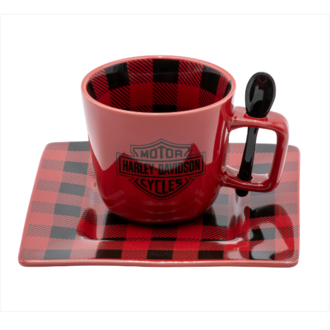 Das Set enthält 360 ml rote und schwarze karierte Keramiktasse und Unterteller. Die Tasse verfügt über ein HD-Logo und einen passenden Löffel mit eingebautem Halter. Spülmaschinenfest.